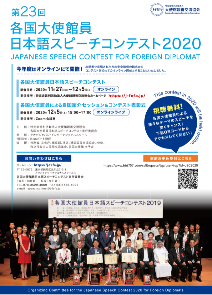 第23回各国大使館員日本語スピーチコンテスト2020 Onlineは、12月5日をもちまして、無事終了いたしました。 ご参加いただきました皆様方をはじめ、本イベントにご後援ご協力くださいました多くの方々に、お礼申し上げます。皆様、本当にありがとうございました。